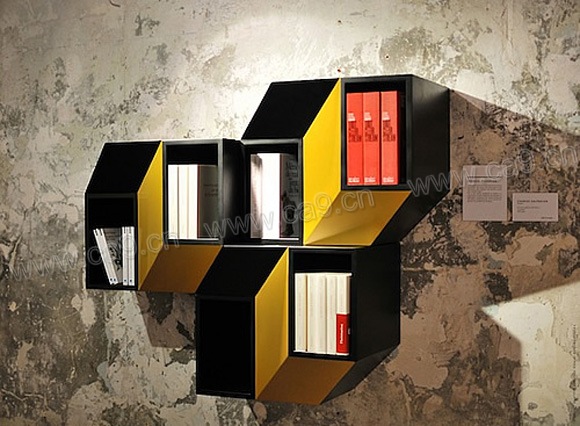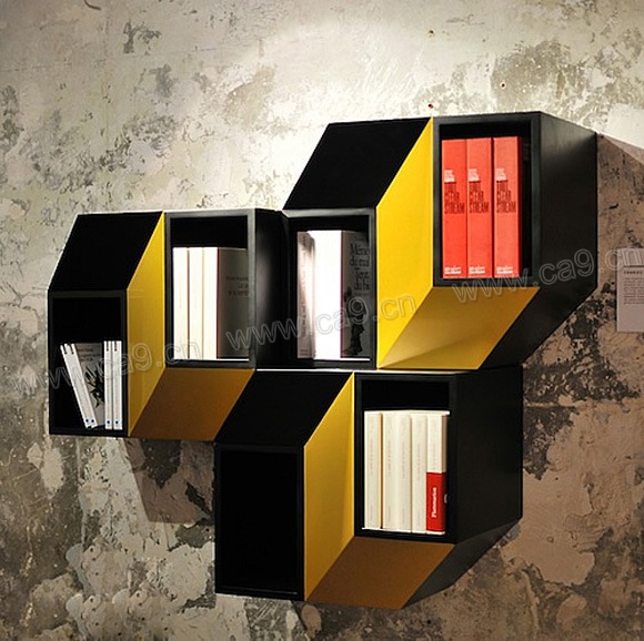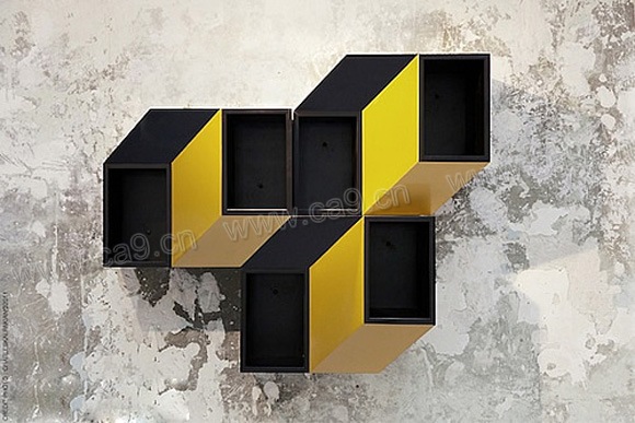 这是一款设计灵感来源于平面三维图像的壁柜产品,第一我们第一感觉是色彩绚丽漂亮,主色调采用的是明亮的橘黄色和深暗黑色结合,强大的色差给我们的视觉带来一种强烈的冲击,对这样的设计能印象深刻。
