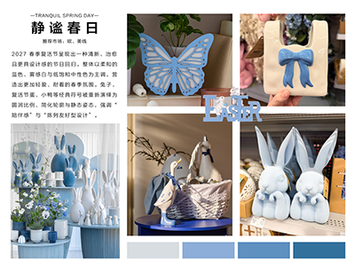 概要:2027 春季复活节呈现出一种清新、治愈且更具设计感的节日回归。整体以柔和的蓝色、雾感白与低饱和中性色为主调,营造出更加轻盈、耐看的春季氛围。兔子、复活节蛋、小鸭等经典符号被重新演绎为圆润比例、简化轮廓与静态姿态,强调“陪伴感”与“陈列友好型设计”。