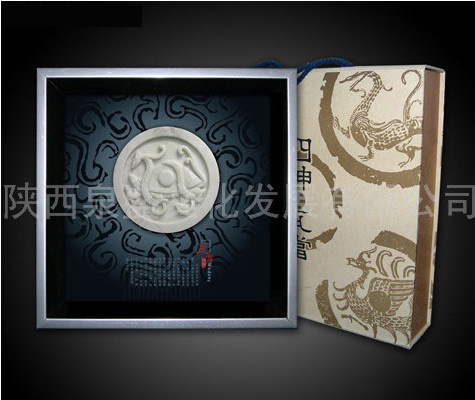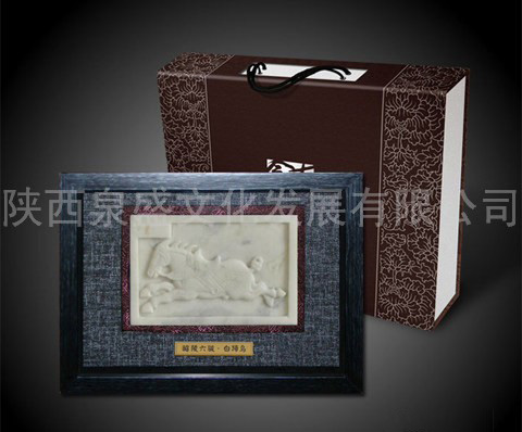 上图展示了昭陵六骏雕刻工艺中的两款,在文物实物造型基础上,根据考古和文物修复等多方资料进行了完善和复原,选取陕西本域的代表原料——蓝田玉为基材,经由民间琢玉名匠之手,精雕细琢而成。产品以布锦和实木线框装配而成,视觉效果典雅大度,最大化展现了盛唐文化的艺术之美和文化气息。居家装饰、办公陈设极具效果