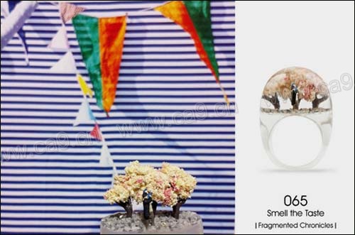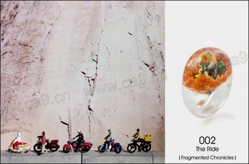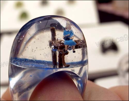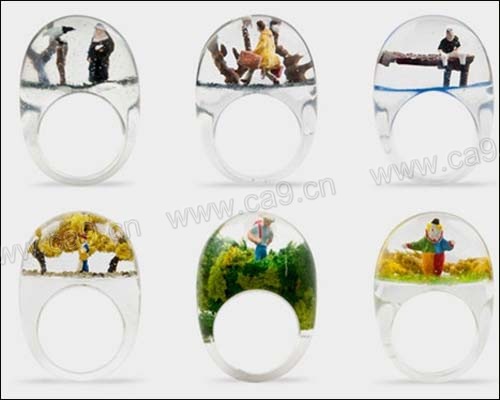 2011东京设计周香港设计师展示了100枚戒指的设计,每个戒指里面都设计了一个人造微型景观,而且都包含不同的主题,从充满童趣的元素到雪地里的修女,从带手提箱行走的女人到牧羊人和羊。每枚戒指都是一个小故事,它能激起人们的想象力和回忆。