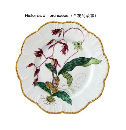 在单色釉上饰以兰花,荷叶边的造型,镶金边,