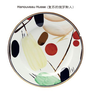 这款陶瓷盘,用及抽象的浅色黄、浅色绿、漆刷红
