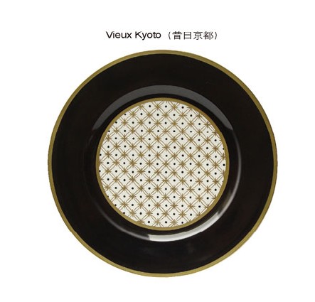 这款陶瓷盘的盘心用规则的网格纹做装饰,而盘沿面用