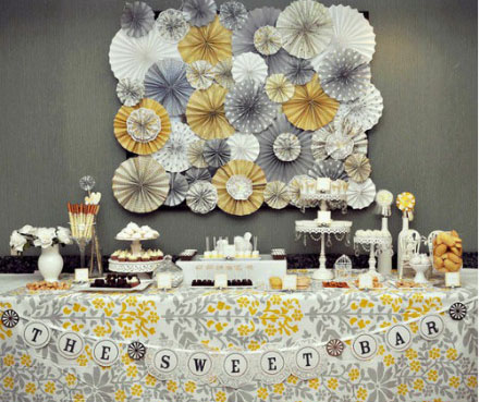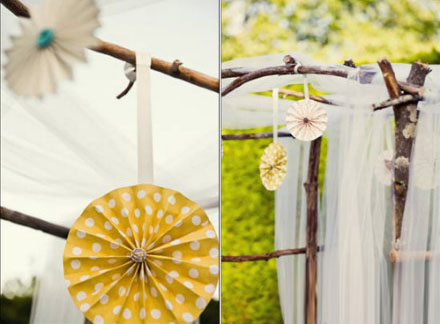 创意婚礼,布置创意手工纸花,既经济又实惠,制作非常简单,使用彩色包装纸折成340度的扇子粘好然后剪除斜角或者其他花边形状,中间加上花蕊装饰,多红颜色和大小搭配起来就成了,是不是很有喜庆气氛!