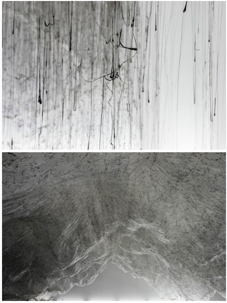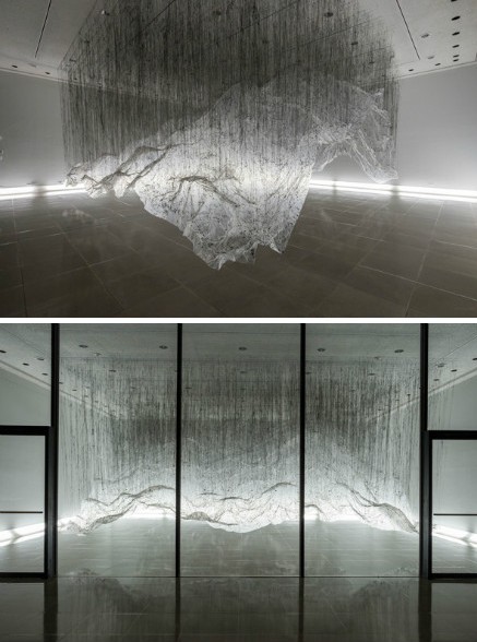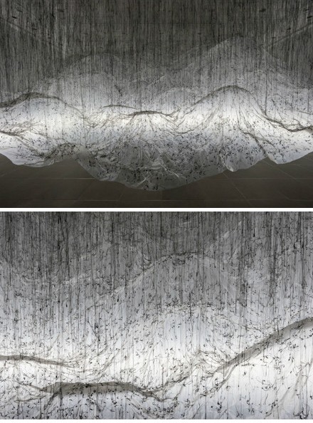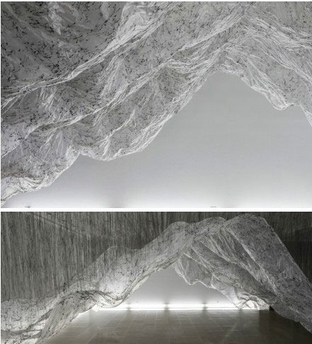 "Reverse of Volume" 是大阪艺术家大西康明最近展出的艺术装置,由黑胶带、塑料膜、尼龙绳等简单朴实的材料组成。作品重申了艺术家对 '无形' 概念的喜好,将时间、空气、重力等不可视的东西用装置表现出来,视觉上仿佛为观者打开了一个本来饱和密集的空间 。