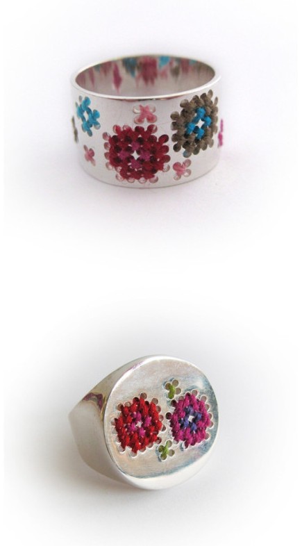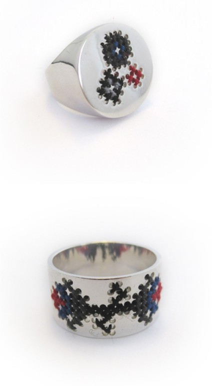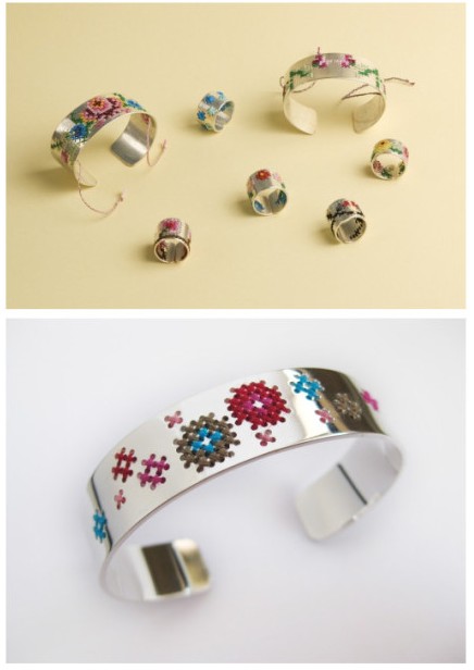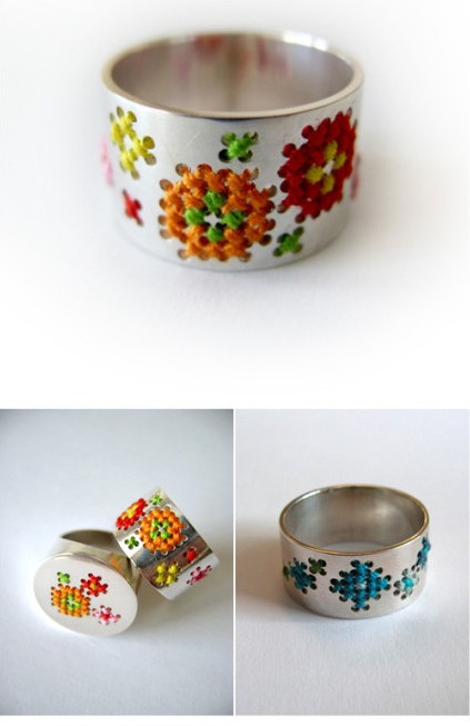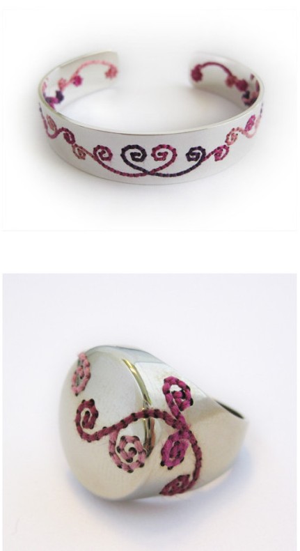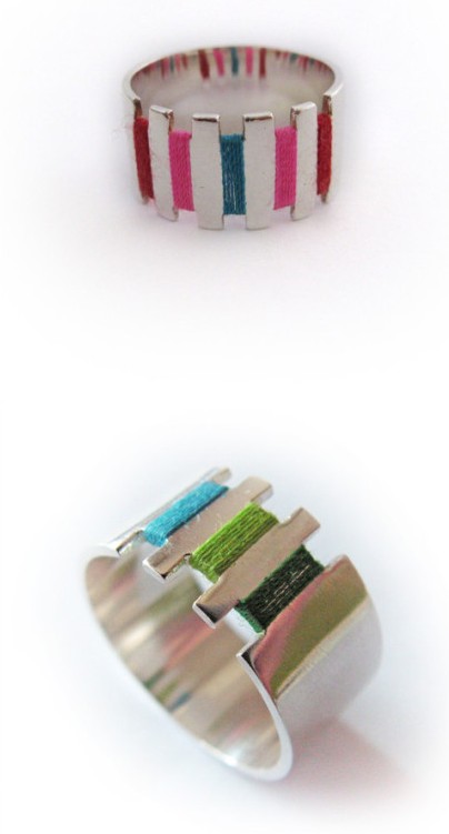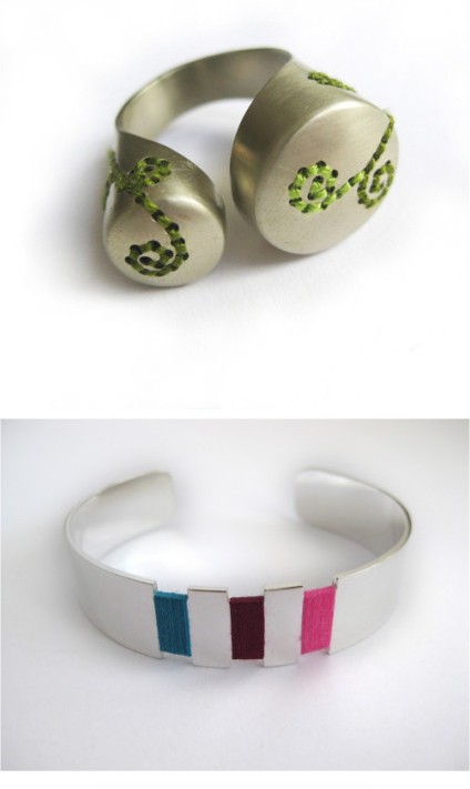 柔软和坚硬,看似对立,却能组合得如此精妙。金属和纤维看上去是不太可能的搭配,但荷兰设计师Corina Rietveld却把它们结合的很出色。她在戒指和手镯上打孔,用彩色的线缝合,缠绕。随着时间的推移,彩色的线老化变色,最终磨损消失,留下的将会是一个更简约的设计。