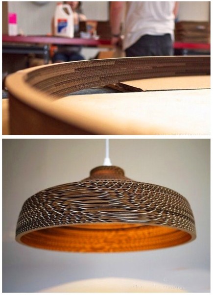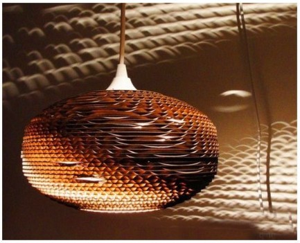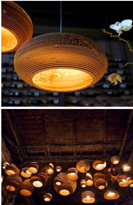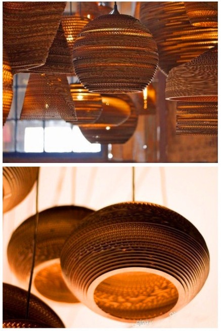graypants设计公司利用回收的包装瓦楞纸,重新设计,利用激光切割成同心圆,然后粘贴起来,就成了漂亮的瓦楞纸吊灯灯罩了,充分利用了材料,又很环保。