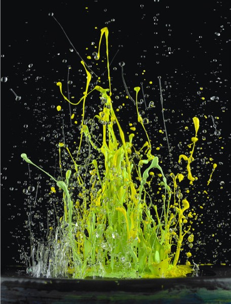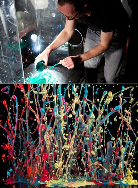 艺术家Martin Klimas把不同颜色的涂料放在一扬声器上,然后调整音量产生的震动让涂料弹起,之后迅速拍照。