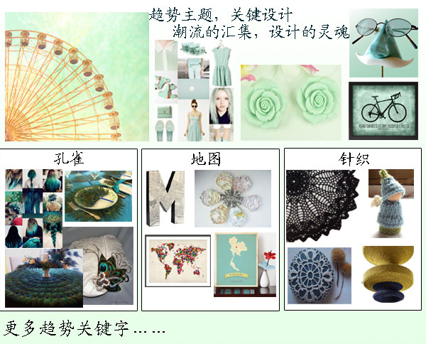 (1)趋势主题,关键设计—潮流的汇集,设计的灵魂:国际工艺界权威潮流趋势主题(孔雀、地图、针织)、流行色彩(薄荷绿)及设计实例。