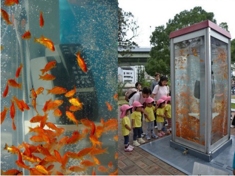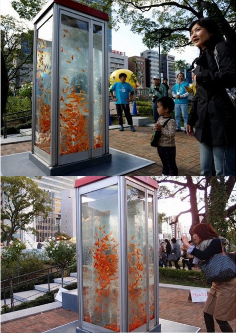 这样的电话亭—大量游动的金鱼,和一部在水中“面不改色”的公共电话。你会因此而驻足吗?