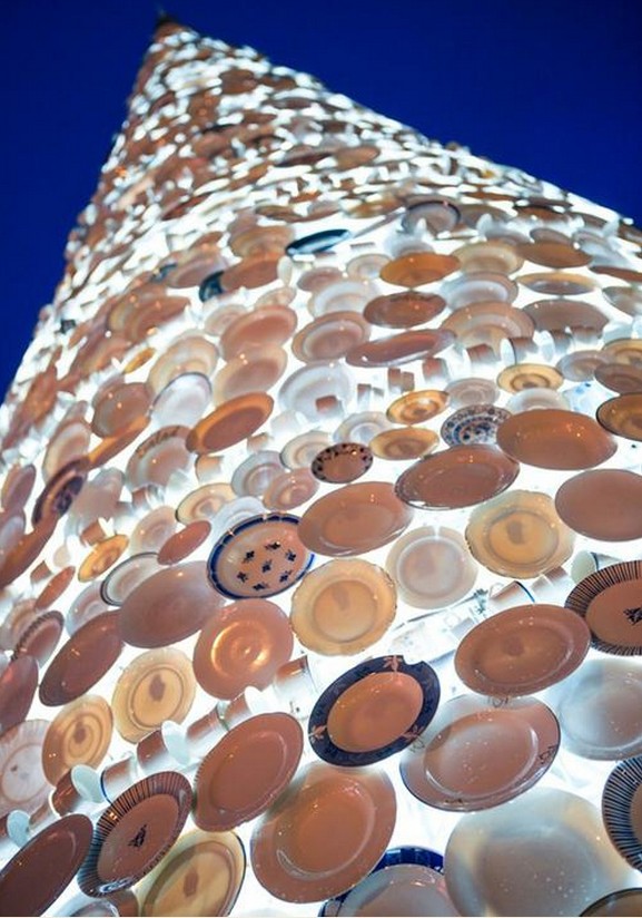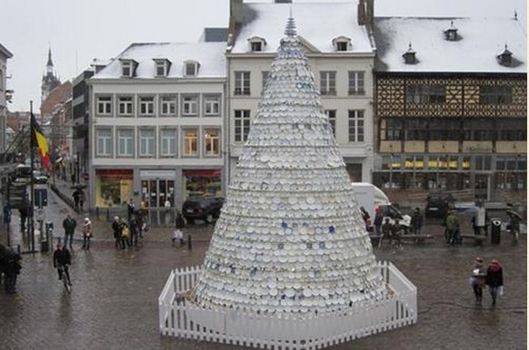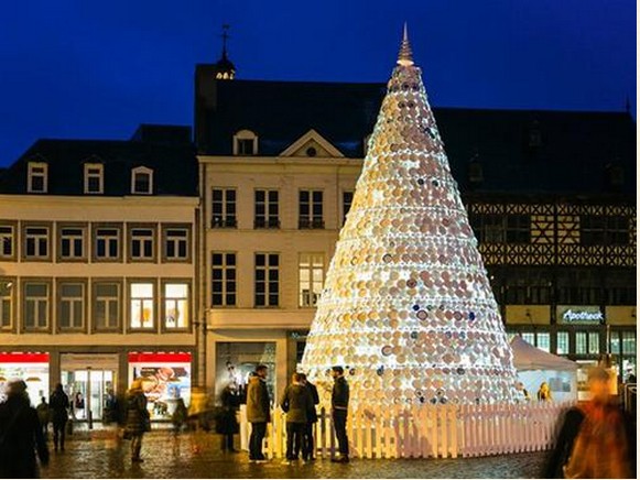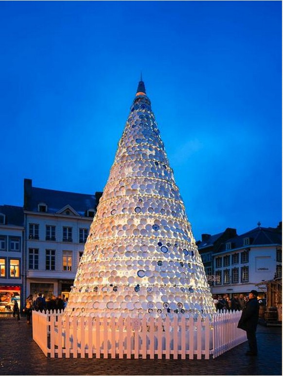 比利时设计公司 Mooz 设计了这个巨大的圣诞树,利用白色的餐盘和杯子以及各种黄色蓝色的装饰,很绚丽。