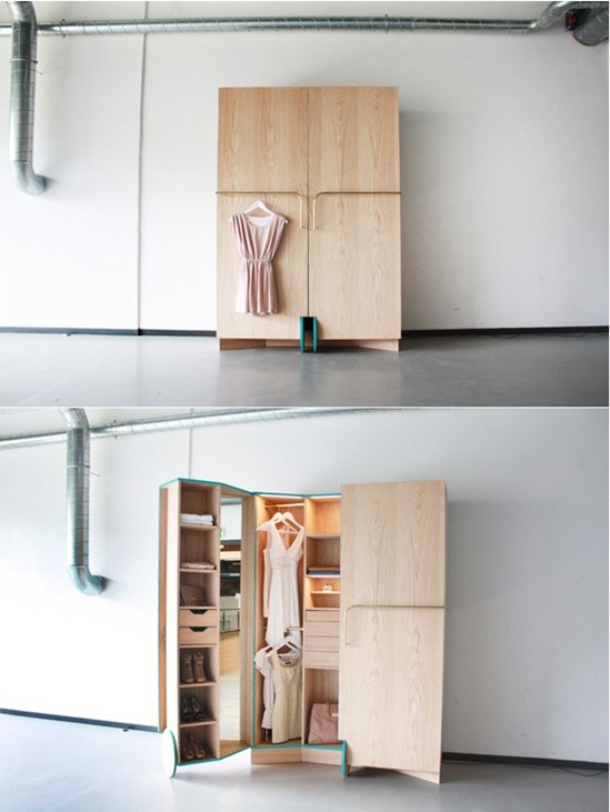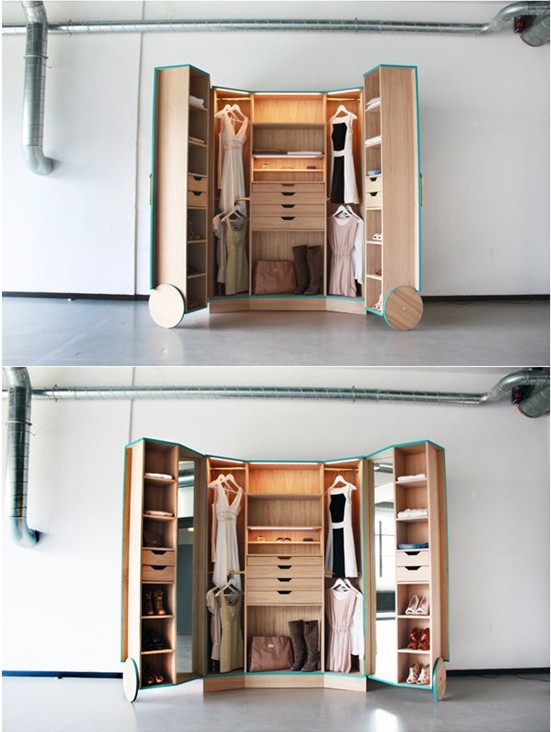 设计师Hosun Ching设计的这款独特的“可以走进去的衣柜”,它的结构层次分明,大大小小的抽屉,格子不下10来个,可以挂衣服,放饰品以及各种美鞋。更秒的是,当你推动柜子底部的轮子,你会惊讶地发现,原来还暗藏了一个穿衣镜,这个巧思的细节设计,既节省下了柜子的整体深度,同时轮子又起到了固定之用,让你在审视妆容和搭配时,不用担心柜门的“摇摆”。