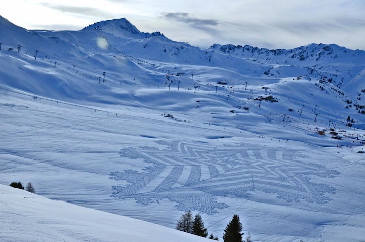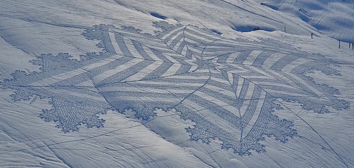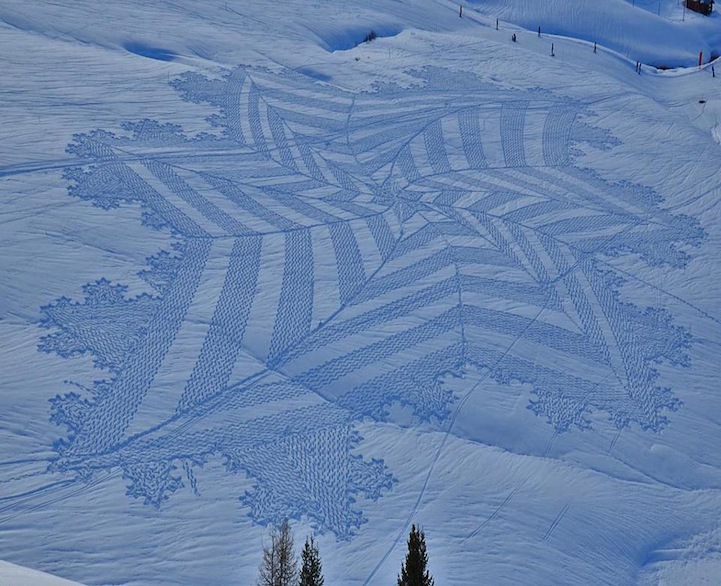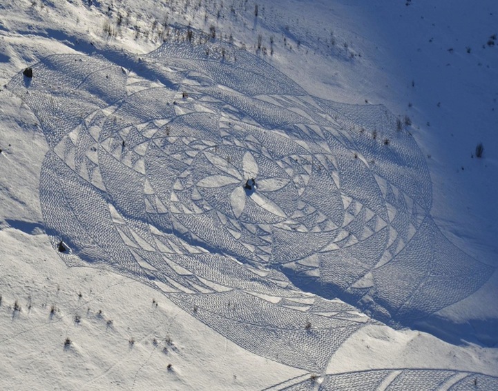 艺术家Simon Beck 的杰作,而且完完全全是他的个人杰作!想想这艺术作品要耗费多少体力热量啊,不过simon说了:“一切都值得,因为他喜欢雪,喜欢大山,他说这是世界上最美的东西。人应该将时间花费在自己喜欢的事上!!”