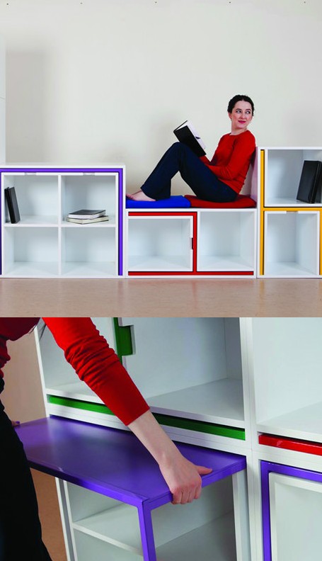 小户型的又一福音。这是一个出人意料的书架:书架隔板之间分布着五颜六色的线条,用手拔出这些线条,发现原来隐藏在里面的是四把椅子和两张桌子。美女设计师Orla Reynolds从舞台布景入手,在研究完舞台布景和观众互动之后,她把房子看成舞台,发现墙是浪费最大的空间,对小户型公寓来说尤其如此。于是她设计了这个名为“看似无中生有(As if from nowhere)”的书架,通过书架到餐桌的移动来反映舞台布景的变化。