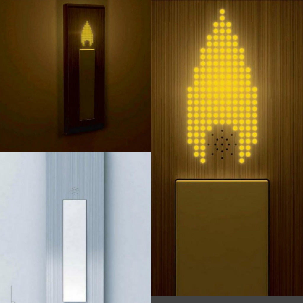 这个蜡烛开关通过LED灯和一块布有多个微孔(肉眼看不到)的铁板模拟出一支蜡烛。奇妙的地方在这里:当房间主灯打开的时候,蜡烛开关上什么都看不见;当主灯关掉之后,你可以看到一支为你指引光明的蜡烛;如果你想彻底熄灯,只需对着开关吹气(开关里面有气流传感器)即可。
