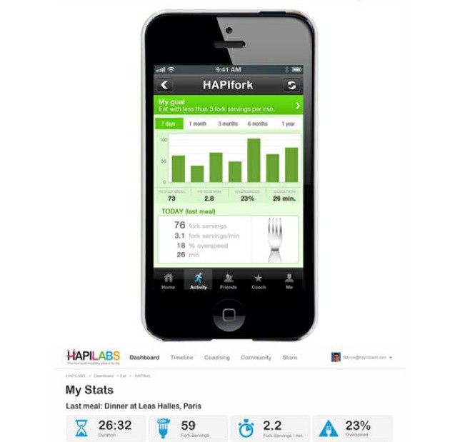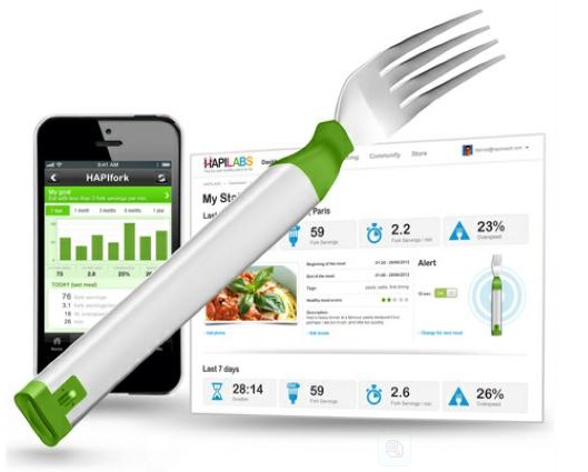 香港幸福实验室(HAPILabs)在2013消费电子展上展出了一款可以帮你减肥的叉子HAPIfork,当你吃饭太快时,它会发出震动,并闪动,提醒你要细嚼慢咽,会因为吃得越慢,饱得越快,吃得越少。