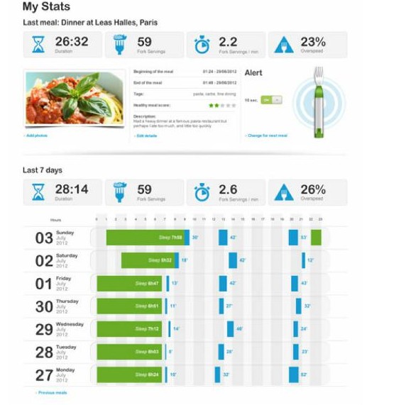 HAPIfork是一款监测用户吃饭习惯的电子叉子,内置传感器,可以计算每分钟叉子从盘子到嘴边的往返次数,以及时间间隔,此外还可以计算吃饭所用时长。HAPIfork叉子会把这些数据通过USB接口传到网上,让你跟踪自己的吃饭习惯。