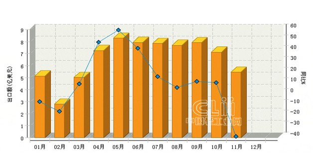 据海关数据显示,2012年1~11月,我国陶瓷制品行业累计完成出口额72.40亿美元,同比增长10.76%。但从月度出口情况看,11月当月陶瓷出口急速回落,当月完成出口金额5.46亿美元,同比下降39.08%,成为1~11月中唯一负增长月份。