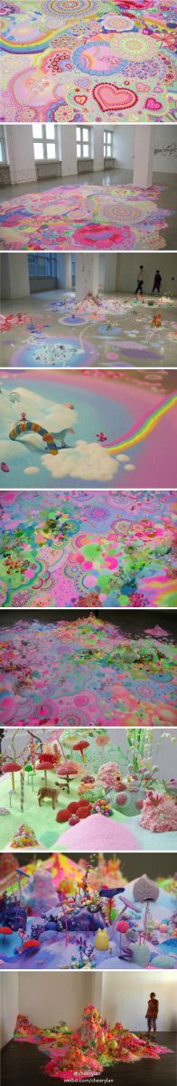 这些梦幻的装置作品来自澳大利亚双人组pip&pop(Nicole Andrijevic和Tanya Schultz)作品中大量运用了一层一层错综复杂的糖果、彩沙,而仔细看看则会发现小树林、小蘑菇甚至小鹿龙猫等各种可爱的细节。