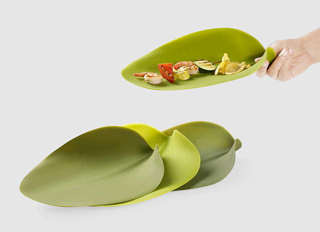 创意灵感来自芭蕉叶的盘子,采用柔软的硅胶材质制成,具有高度稳定性,洗碗机、微波炉、电烤箱都能够使用,耐热高达华氏425度。每套四只都有着细微的形状和色彩差异,仿佛树上摘下的真叶子。硅胶的柔软特性让它可以随意卷曲,不用的时候扎起来随意收纳,是不是很有趣呢~