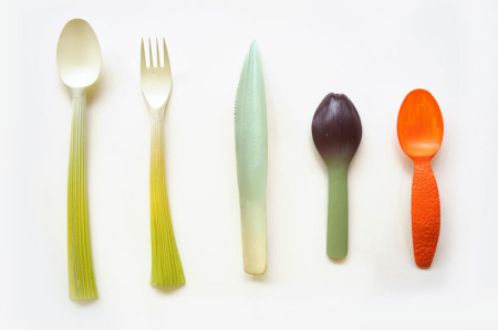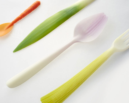 西餐中明晃晃的金属色刀叉餐具总是给人一种不寒而栗的恐惧感,来瞧瞧国人设计师制作的这套鲜蔬餐具,模仿各类水果蔬菜等外观纹理与色彩,包括胡萝卜饭勺、芹菜叉子、葱叶切刀等等,让人充满食欲。此外,整套餐具为可降解材料制成,可谓功能与审美俱全。