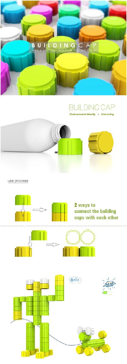 兰州理工大学的赵生鹏、王鹏、冯顺、高超设计的“积木瓶盖”(Building Cap)可以像积木一样组合起来,拼成房屋、机器人等各种形状。通过精巧的设计,小小的瓶盖就变成了五颜六色的积木玩具。“积木瓶盖”在给孩子们带来无穷乐趣的同时,还为绿色环保做出了一份贡献。