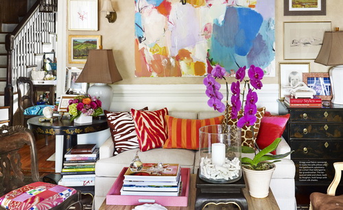 整体为现代抽象风格的家居搭配,多彩——橙、棕、罂粟红,带点野性的色彩,搭配动物纹、条纹等同样带点野性的图案,墙上的水彩涂鸦式壁画突出了整体氛围。