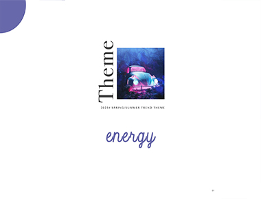 概要:由于受新冠的影响,人们生活在一个变革的不确定性的世界,内心需要从自然界汲取灵感以示安慰,让人们能够平静的对待当下的状态以及未来多要面对的变化。自然能量主题将灵感着眼于户外的花朵,重要的色彩是长春花蓝搭配绿色为主的色调,蓝紫色这不是一个单色而是一种蕴含能量的色彩,让真实世界与虚拟有所交融,能够给予人们力量。在元素上则可以融入柔软的材质增加产品的亲和力,同时在材质上加入折纸产品,融入手工艺的创意。高反光的材质加入为这个主题增加了一些科技感。让人们相信未来的世界是活力的,充满期待的。