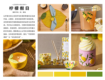 概要:以柠檬为核心视觉符号的清新果趣风正迅速升温,从餐厨、家纺到装饰摆件全面渗透。采用高饱和柠檬黄搭配柔和奶油色与自然绿调,同时加入轻盈粉色,为整体氛围增添甜美趣味,营造明亮、愉悦且极具社交传播力的空间感受。