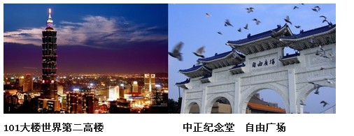【中正纪念堂】,自由广场,中正纪念堂宝蓝色琉璃瓦、白色大理石建筑,展示蒋介石的生平事迹。外围极富古意的蓝白围墙,遍植红花绿树一片盎然。两旁的戏剧院与音乐厅,是一流国际表演艺术殿堂。