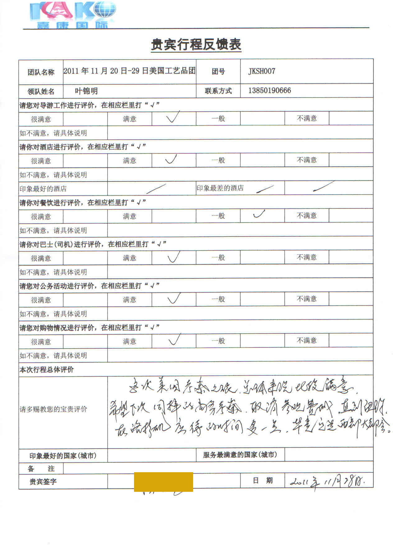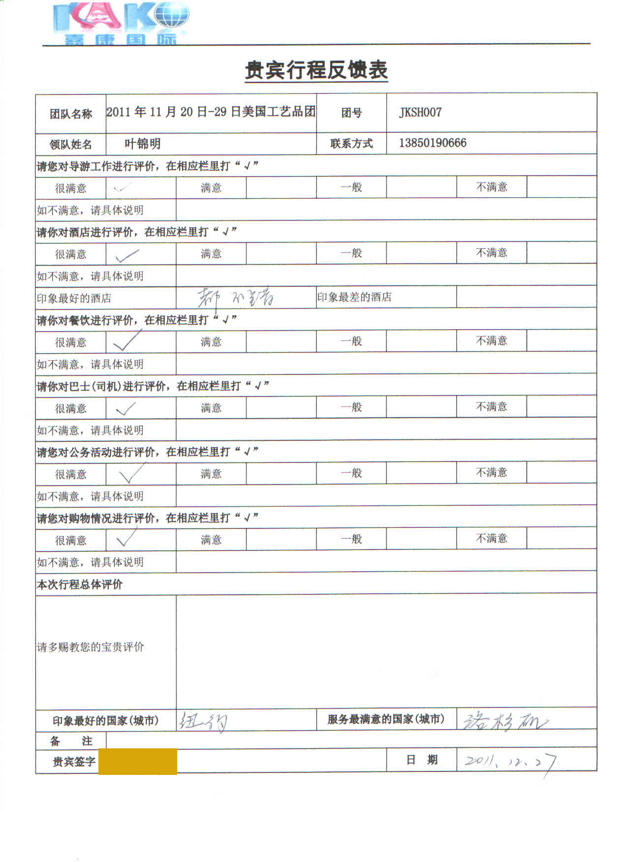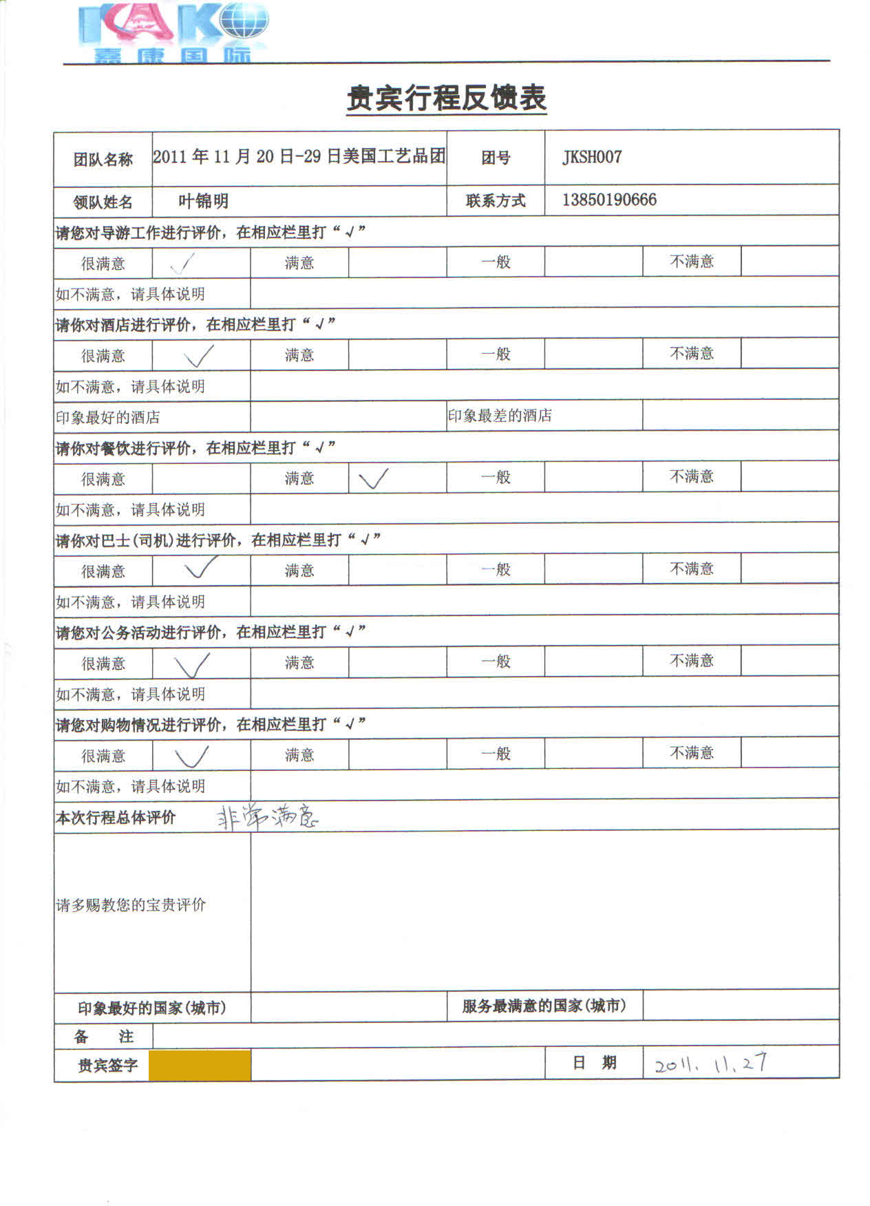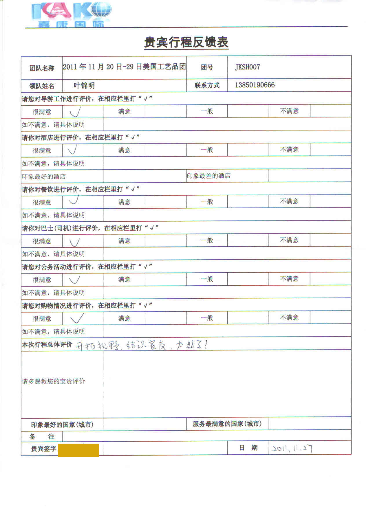 十一月份考察团成员普遍反映对考察行程和效果很满意。以下是部分情况反馈表。