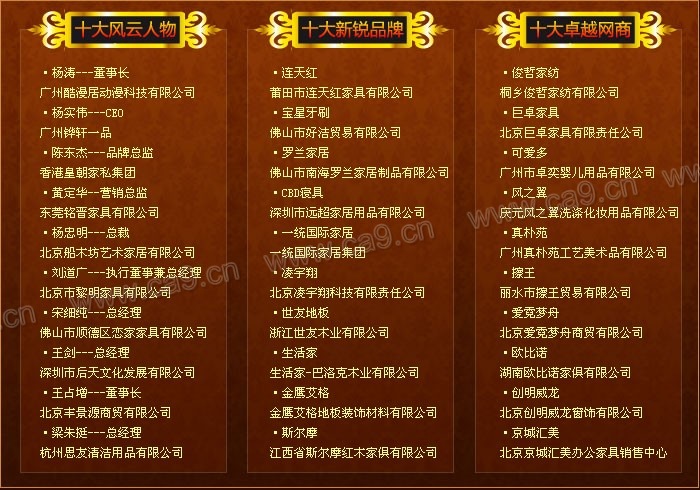 据悉,此次颁奖盛典评选出了“十大风云人物”、“十大新锐品牌”、“十大卓越网商”三项大奖。获得十大风云人物的是:广州酷漫居动漫科技有限公司董事长杨涛;广州铧轩一品CEO杨实伟;香港皇朝家私集团家梦健康寝具股份有限公司品牌总监陈东杰;东莞铭晋家具有限公司营销总监黄定华;北京船木坊艺术家居有限公司总裁杨忠明;北京市黎明家具有限公司执行董事兼总经理刘道广;佛山市顺德区恋家家具有限公司总经理宋细纯;深圳后天文化发展有限公司和上饶杰克工艺品有限公司总经理王剑;北京丰景源商贸有限公司董事长王占增;杭州思友清洁用品有限公司总经理梁朱挺。获得十大新锐品牌的是:连天红、宝星T型牙刷、罗兰家居、CBD寝具、一统国际家居、凌宇翔、世友地板、生活家、金鹰艾格、斯尔摩。获得十大卓越网商的是:桐乡俊哲家纺有限公司;北京巨卓家具有限责任公司;广州市卓奕婴儿用品有限公司;庆元县风之翼洗涤化妆用品有限公司;广州真朴苑工艺美术品有限公司;丽水市擦王贸易有限公司;北京爱霓梦舟商贸有限公司;湖南欧比诺家俱有限公司;北京创明威龙窗饰有限公司;北京京城汇美办公家具销售中心。