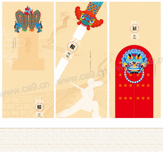 一套采用三原色为主,产生强烈的色彩对比,渲染龙年喜庆;二套采用宣纸色映衬出浓浓的中国风。