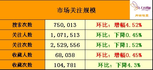 月以来,与“家居饰品及礼品工艺”市场相关的关键词的搜索次数较上个月上升了4.52%。相关产品的收藏人数较上个月也略有上升,达到68,038人次。但值得注意的是关注人数达和关注次数以及收藏次数都较上个月的数据有所下降。市场的关注次数下降了1.52%,本月的关注次数为2,529,556次。
