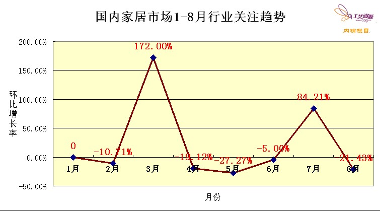 来自中国建材网的部分数据也显示9月上旬销售旺季大环境开始转暖,家具市场的行情将再度飘红。预计在接下来的一段时间内将会出现平稳的增长趋势。