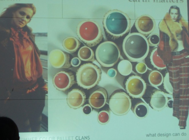 设计卖的不单单只是产品本身,更是产品身上的故事,设计的灵感和理念。这次讲座的讲师Leontine Wagenaar是荷兰设计师协会顶尖的设计师之一,她的主打领域是服装设计,对家居装饰、餐具、礼品、地毯、家用纺织品、照明、小家具、食品、玩具、折纸也有一定的了解。她与她的团队组成了一个工作室叫Tanjasoeter,针对服装时尚设计、家居装饰、手提包设计、产品包装方面的设计。这个团队同时提供创意策略和品牌管理服务。基于全局的发展趋势预测后,提供企业创新咨询的服务。他们可以单独为一家公司量身定制产品发展和设计报告,包括灵感库、产品设计、艺术指导、产品配饰规格、详细的素描和大小、为您设计团队做培训和指导、设计师和学员管理等多方面的内容。