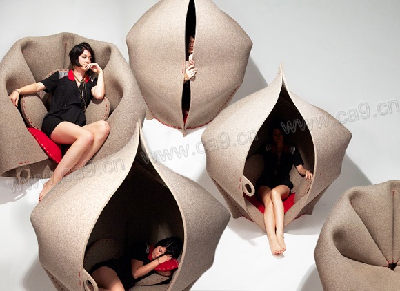 劳累了一天回到家中,第一个动作便是将自己扔进松软舒适的大沙发中,感觉就像被温暖地怀抱着。懒散时横躺竖卧,高兴时上蹿下跳。沙发是与人最亲近的家具,既然如此,挑选沙发就不能太随便。沙发在家中的地位举足轻重,个中的讲究还真不少。刚毕业的设计系学生Freyja Sewell设计了一款可开放可隐蔽的沙发,平时就像正常的沙发椅子一样,当我们想一个人呆的时候可以将这个沙发封闭起来,进入一个人的世界。这款沙发采用可降解的环保绿色材料手工剪裁缝合而成,色彩配色时尚鲜艳。Designer:Freyja Sewell