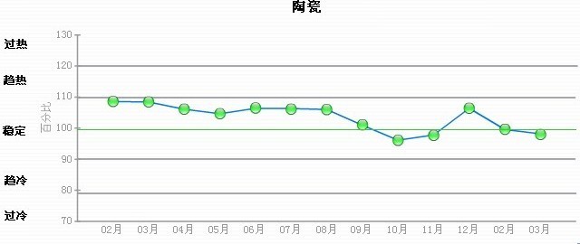 陶瓷产值景气指数连续13个月来均在稳定区域中心线上,保持平稳态势,参见图3-4。