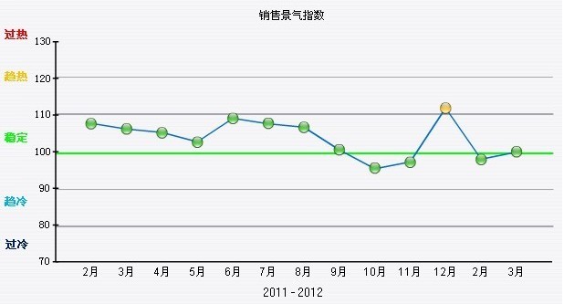 陶瓷销售景气指数连续13个月走势与产值景气指数基本相同,2011年2月至8月,各月销售景气指数均在稳定区域中心线上;2011年9月至2012年3月,销售景气指数上下波动,2011年12月景气指数为111.93,表现趋热,之后2个月回落至稳定区间,参见图3-2。