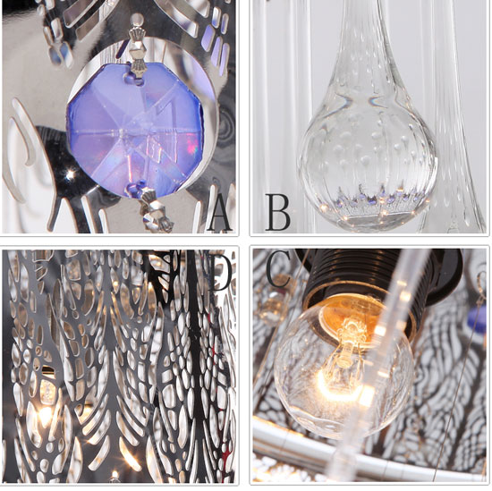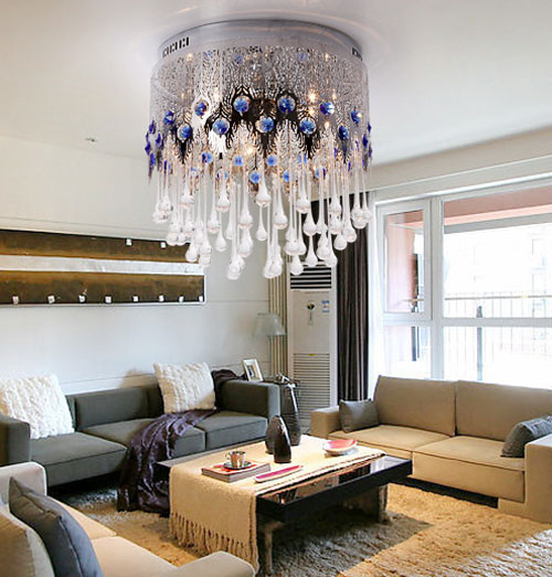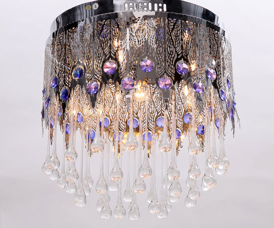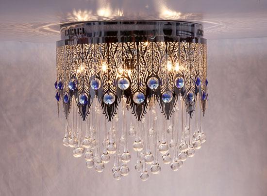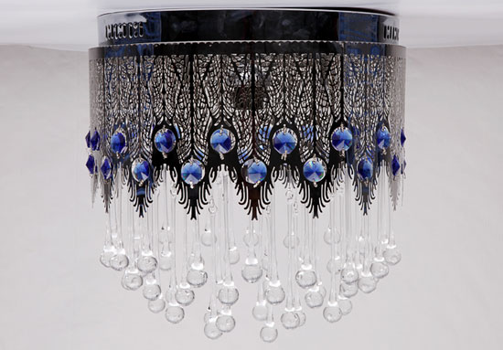 奢华高贵的后现代凤尾蓝吸顶灯,透明的水滴,晶莹剔透,切割精良,透过灯光的折射,璀璨至极!