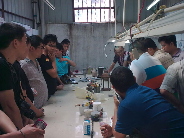 工艺资源2012年5月份迎来了30多家会员企业,到场参加2012年春、秋季热门效果应用和配件产品搭配艺术培训两个课程。本次课程由我公司研发运用部陈经理和CDS创意总监危有发先生亲自授课,对新材料3D立体漆,仿生铁、古锈漆、色粉剥落等几种热门效果进行详细的技术讲解。还有介绍了如何搭配配件产品,以及分析了当下材质结合的优势和市场,并在当日下午和次日进行了点对点的技术培训,特别增加一项-纳米喷镀现场演示 ,以期帮助会员企业提升技术运用水平。