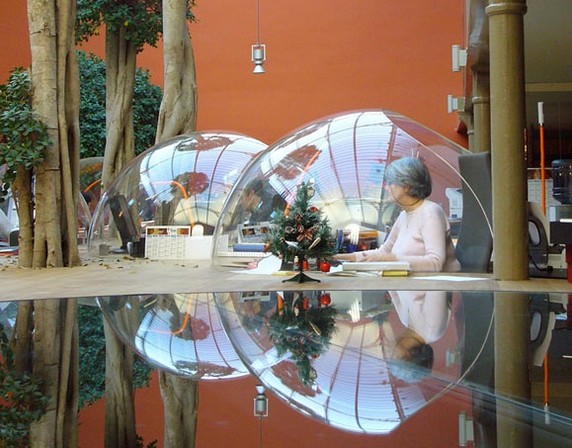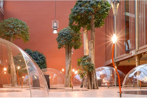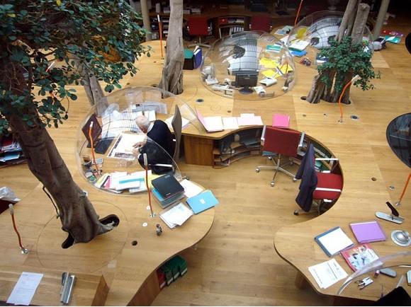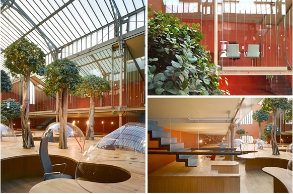 千万不要以为这是某处人类未来的太空定居点,也不要认为这是哪里刚被挖掘的远古居住洞穴,这是现实中位于巴黎的一家创意工作室的办公空间。该工作室是由一幢19世纪末的工业化建筑大厅改造而成,整体空间被一层木板隔为两层,员工的座位像一个个独立透明的细胞分布其中,由蜿蜒的通道有机连接;弯曲的灯光、直挺的熊猫树点缀在木板上,与透明玻璃球相得益彰;里面休息室、会议室一应俱全,四周甚至都安排了档案室、衣帽间和厨房。对传统办公空间进行如此新颖的设计,真是让人不得不佩服!
