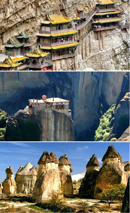 【古怪住所】1.中国恒山悬空寺:悬崖上的奇迹;2.希腊Meteora修道院:隔世的空中之城;3.土耳其卡帕多西亚:联合国遗产小镇;4.葡萄牙Casa do Penedo:整块石头掏出来的屋;5.西班牙Setenil de las Bodegas村:岩石上凿出来的房子。你想体验哪个?