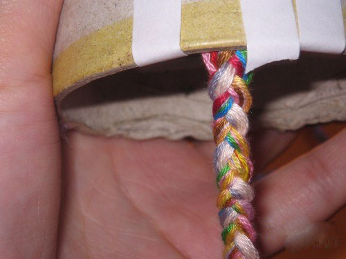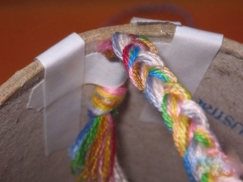 将绣线编成若干条麻花辫 ,固定在线轴上, 原本想用订书机订的, 后来发现线轴太硬, 就用双面胶粘粘 也ok啦。