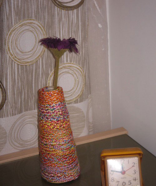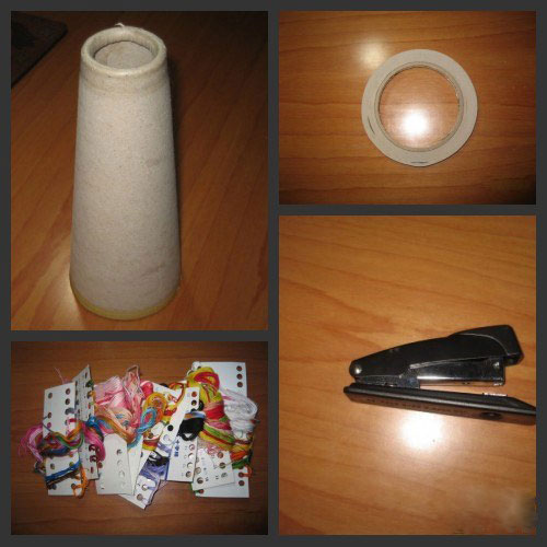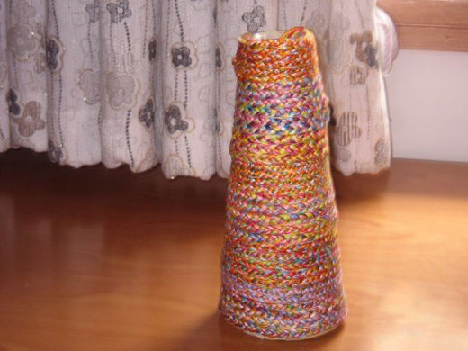 线轴和线的妙用:家里有绣十字绣的,可以把线轴的剩下的线留下来凑起来做个花瓶玩玩,材料 :线轴一个, 绣线若干, 双面胶 , 订书机