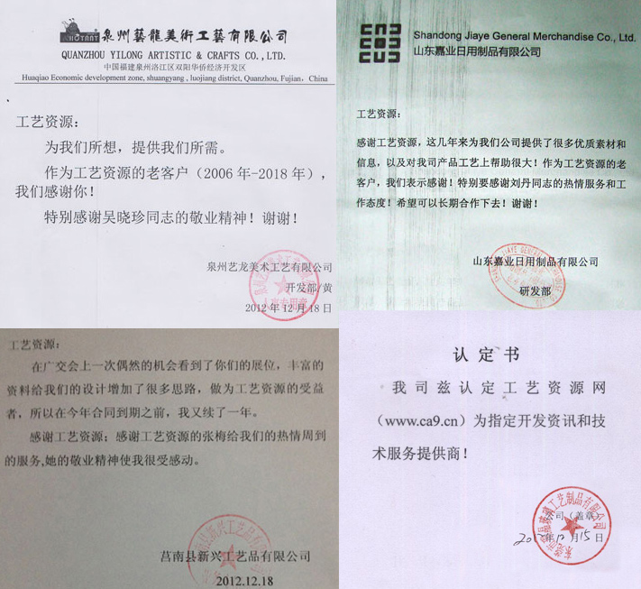 作为工艺品行业的开发设计整体服务商—工艺资源网,在从一般服务商到能够为客户提供咨询服务的高级服务商的转变、在不断满足客户需求的过程中,也得到客户的众多好评。以下是我们在各种客户服务中获得的鼓励: