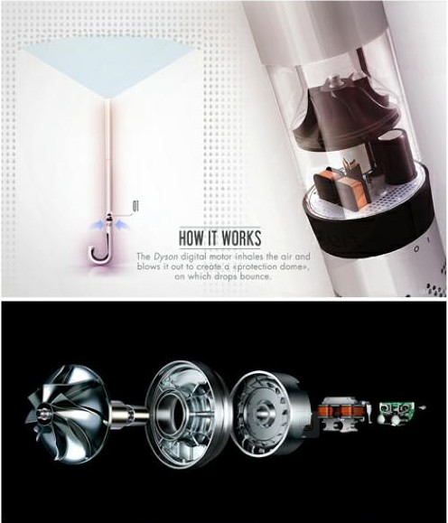 “气流2050”概念伞由法国设计师Quentin Debaene设计,是一款面向未来的伞,它摆脱了传统的有形的伞,取而代之的是空气。这把伞采用Dyson数字马达作为动力,使用时先把伞柄抽出拉长,露出马达,然后转动位于伞柄上的圆盘,接着真空吸尘器会吸入周围空气,在伞的顶部形成一个圆顶气流,将雨水拒之伞外。