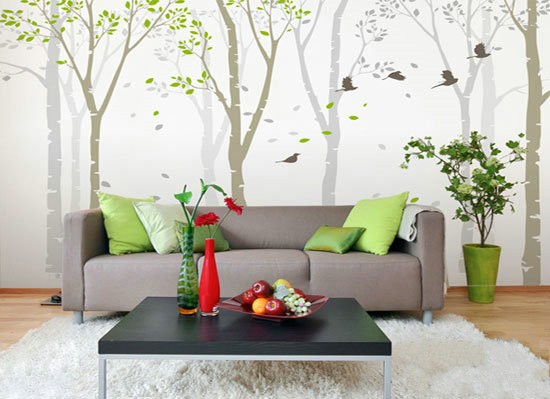 灰色的沙发搭配草绿色的靠垫,给人带来一种秋天的感觉。而沙发背景墙上树木造型和一旁的绿色盆栽,虚实结合,更将秋天的气氛凸显得更浓郁。