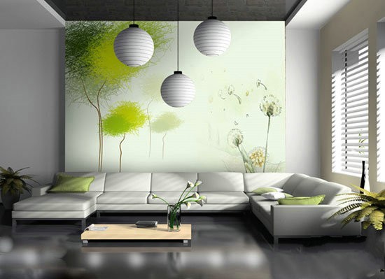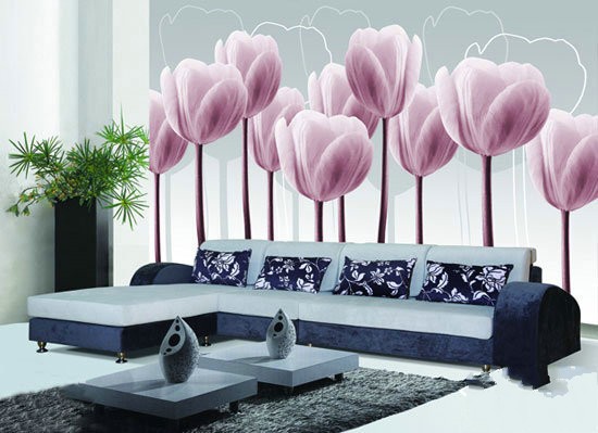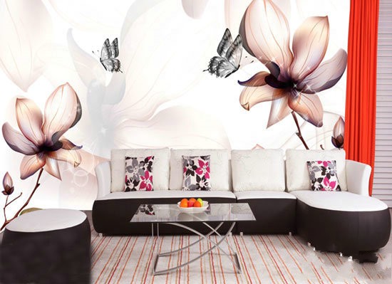 沙发背景墙的装饰注重和沙发乃至客厅整体的搭配。这个沙发背景墙选用了和靠垫相似的图案,使这个客厅在风格得到了很好的统一。大朵的花朵图案,和翩翩飞舞的蝴蝶,更是营造了花的世界。