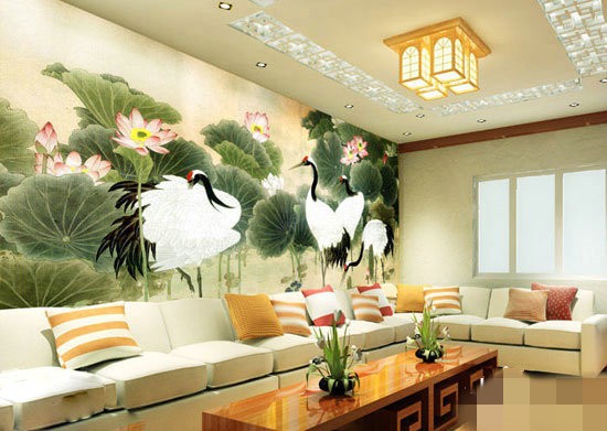 中式风格的茶几、别致的吊灯,而选用了仙鹤,莲花的沙发背景墙,很好地融合了这个客厅的风格,将浓郁的中国味道极好的展现了出来。